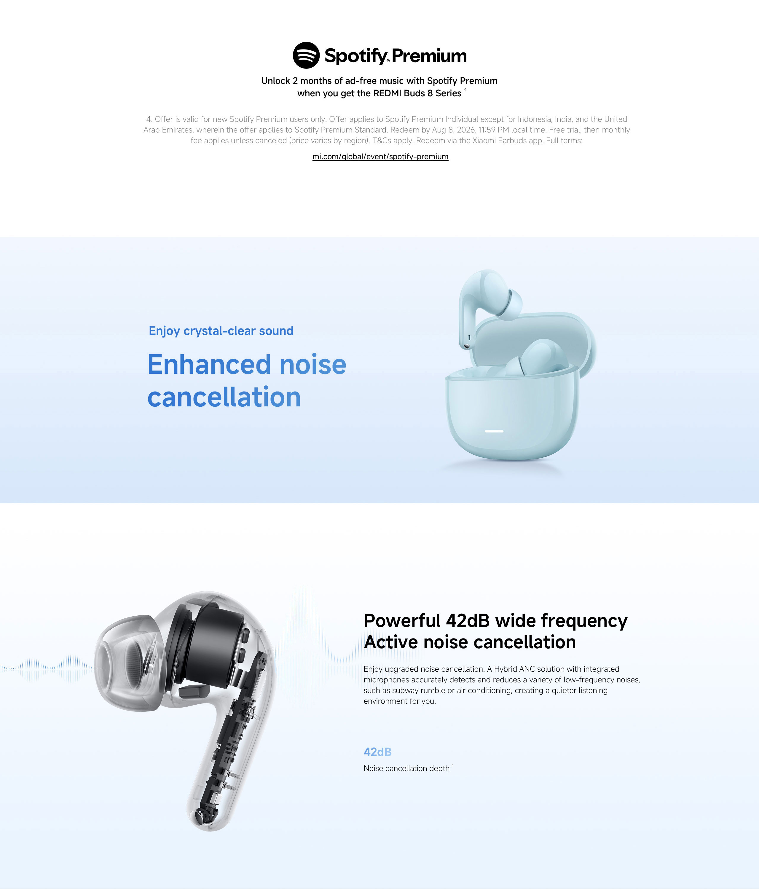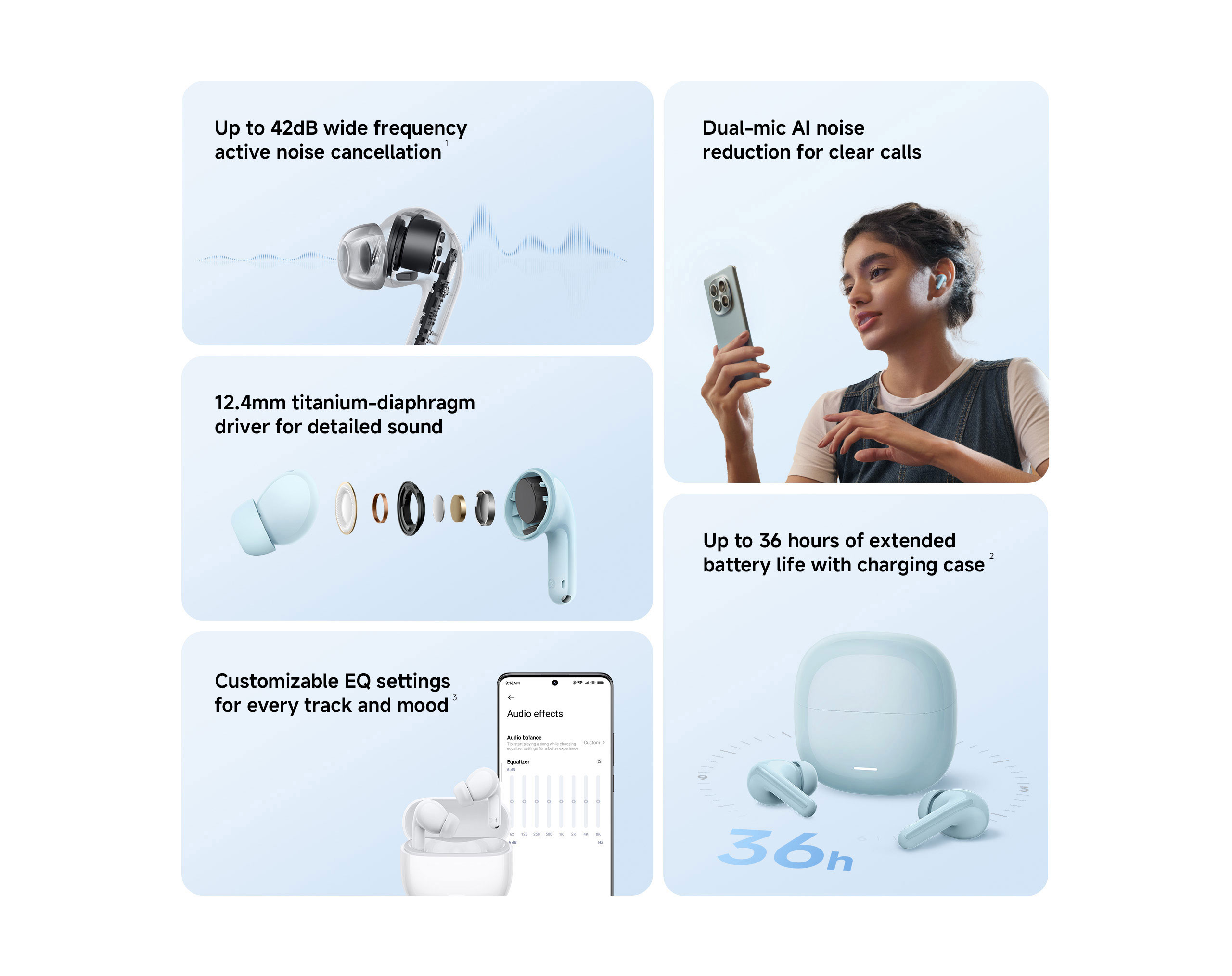 Hybrid ANC reduces ambient noise by up to 42dB, helping block traffic, chatter and office noise so you can focus on what you’re listening to or enjoy quieter calls in noisy environments.