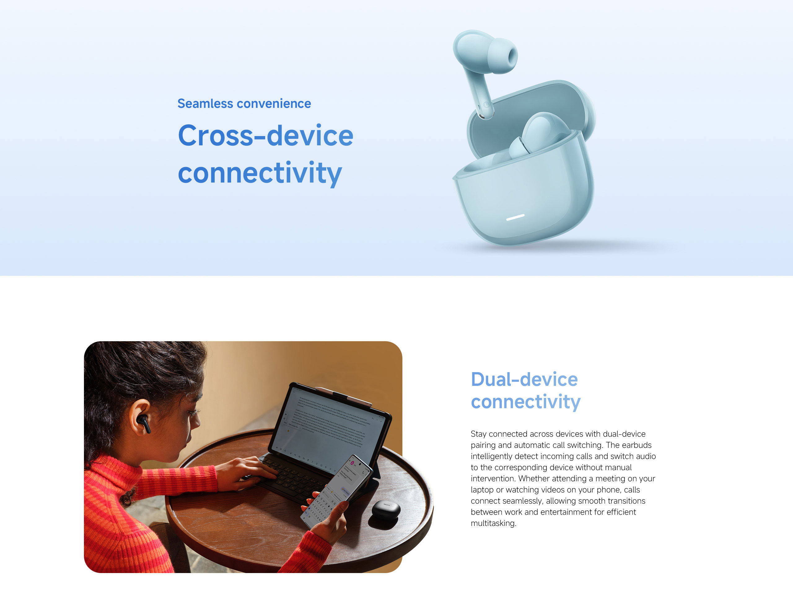 Each earbud is equipped with dual microphones and AI noise reduction that intelligently filters out background noise, keeping your voice clear during calls, online meetings and voice chats.