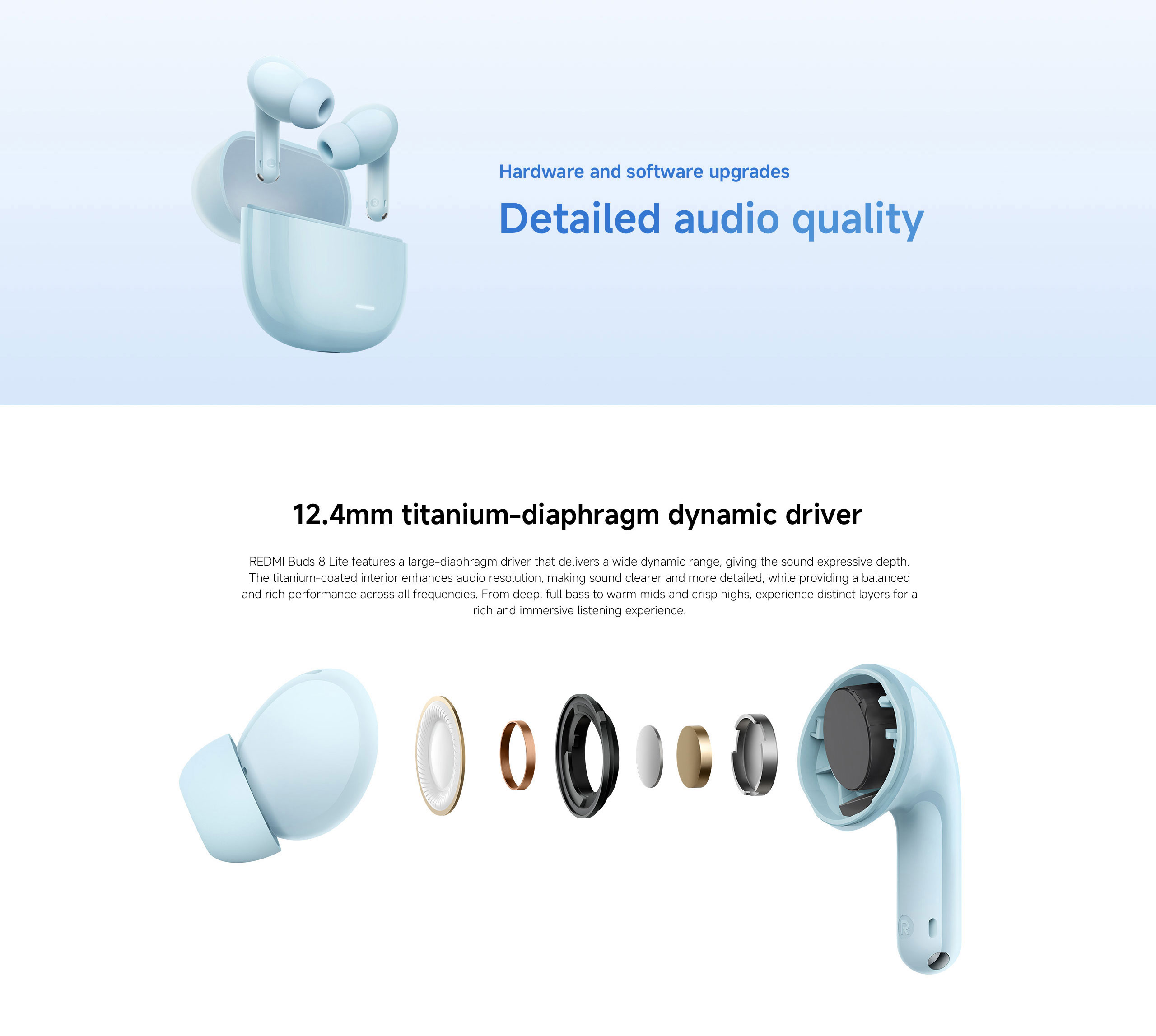 The Redmi Buds 8 Lite feature a large 12.4mm dynamic driver tuned for strong bass, clear mids and detailed highs, delivering an energetic sound profile ideal for music, videos and gaming on the go.