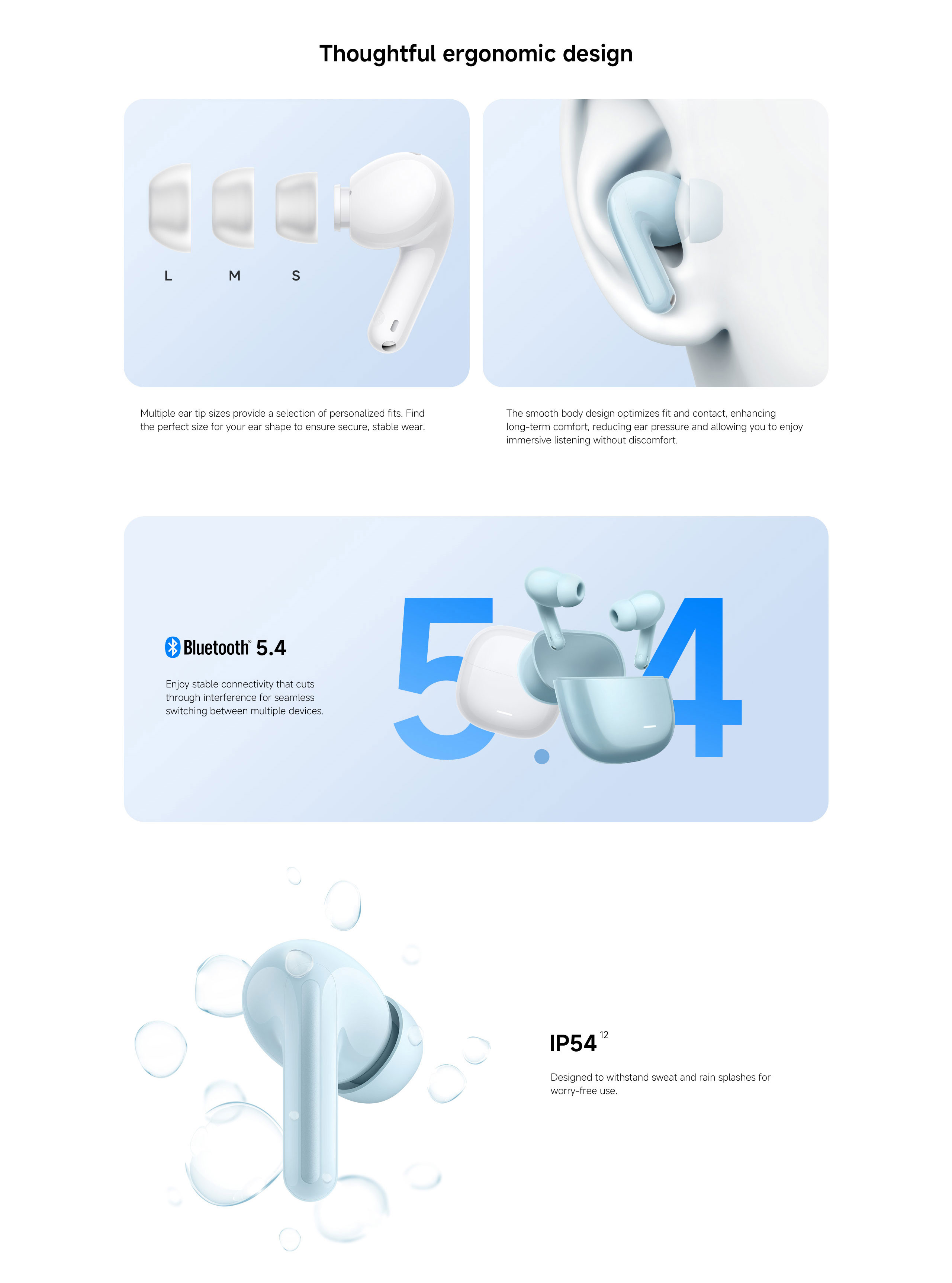 The ergonomic in‑ear design keeps each earbud light and secure for long listening sessions, while IP54 dust and splash resistance makes them suitable for daily use and workouts.
